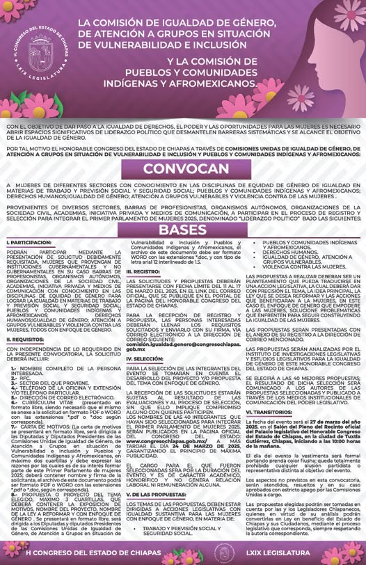 Las interesadas pueden consultar las bases y requisitos de registro en el sitio web oficial del Congreso de Chiapas: www.congresochiapas.gob.mx. La convocatoria está abierta a mujeres de todas las regiones del estado que deseen aportar ideas y propuestas para la construcción de un entorno más inclusivo y equitativo.