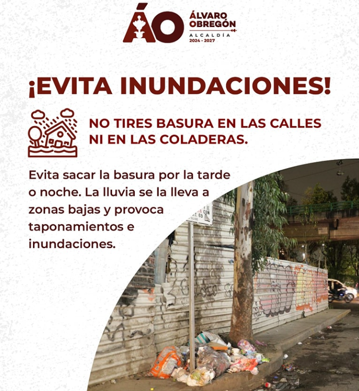 Bajo la campaña “#VecinoModelo”, la demarcación capitalina exhortó a no tirar basura en la vía pública ni en espacios naturales, ya que estos actos obstruyen el sistema de drenaje y pueden provocar encharcamientos e inundaciones que ponen en riesgo la seguridad de las familias.