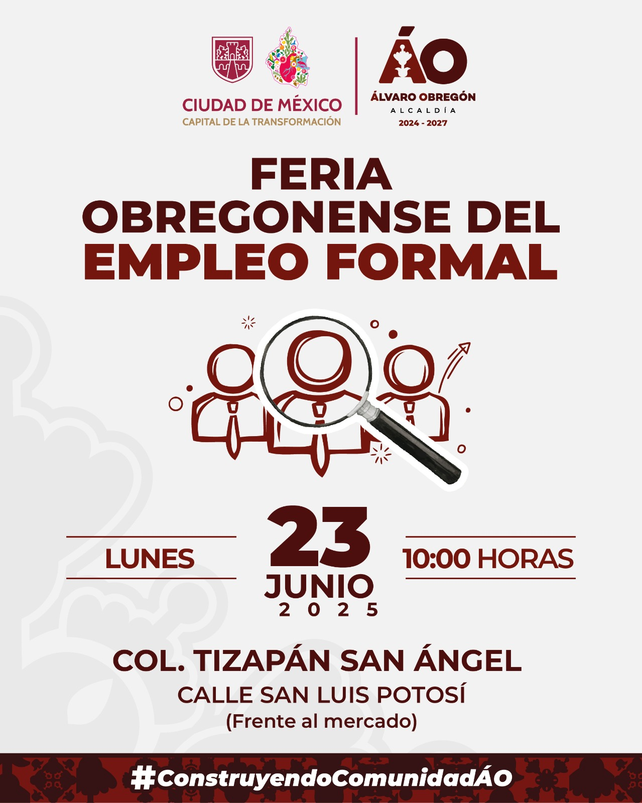 Con el objetivo de acercar oportunidades laborales a la población y fomentar la inclusión económica, la Alcaldía Álvaro Obregón llevará a cabo la Feria Obregonense del Empleo Formal este próximo lunes 23 de junio, en la colonia Tizapán San Ángel, a partir de las 10:00 de la mañana.