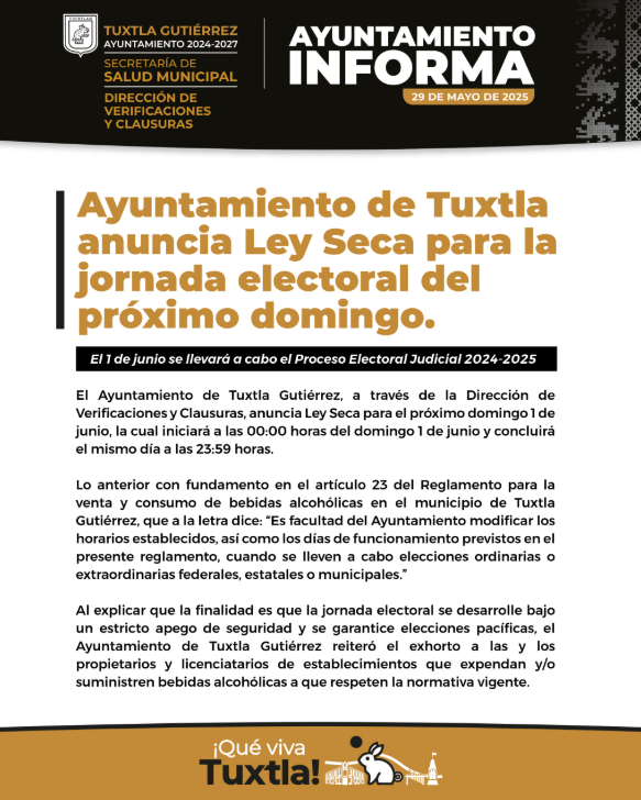 Con motivo del Proceso Electoral Judicial 2024–2025, el Ayuntamiento de Tuxtla Gutiérrez informó la aplicación de la Ley Seca este domingo 1 de junio. La medida, anunciada por la Dirección de Verificaciones y Clausuras de la Secretaría de Salud Municipal, prohibirá la venta y consumo de bebidas alcohólicas desde las 00:00 hasta las 23:59 horas del mismo día. El fundamento legal para esta disposición se encuentra en el artículo 23 del Reglamento para la venta y consumo de bebidas alcohólicas en el municipio, que faculta al Ayuntamiento a modificar los horarios y días de operación de los establecimientos en casos de elecciones ordinarias o extraordinarias.