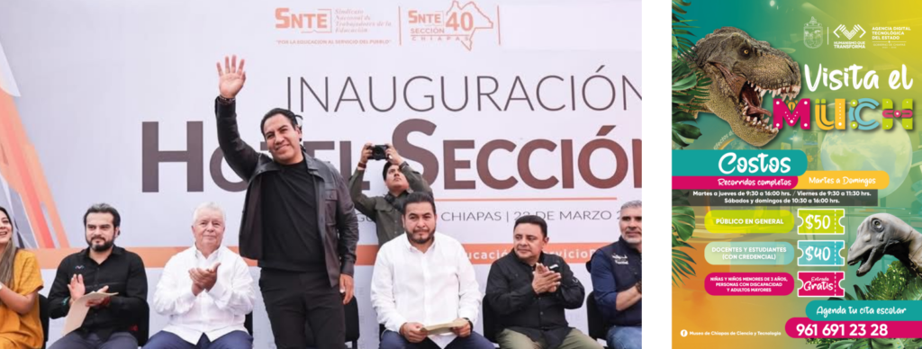 El gobernador Eduardo Ramírez Aguilar acompañó al secretario general de la Sección 40 del Sindicato Nacional de Trabajadores de la Educación (SNTE), Oved Balderas Tovilla, a la inauguración del Hotel del Maestro, en Tuxtla Gutiérrez, donde reconoció la labor de maestras y maestros en favor de la educación en Chiapas y destacó que este logro representa una conquista en la defensa de sus derechos laborales.