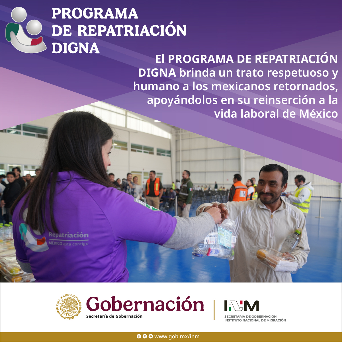 En cumplimiento de su compromiso con los derechos humanos y la dignidad de las personas mexicanas en retorno, el Instituto Nacional de Migración (INM), a través de la Dirección de Repatriación Digna, impulsa acciones para garantizar que los connacionales repatriados desde Estados Unidos y Canadá sean recibidos con respeto, seguridad y atención integral. El objetivo es promover su reinserción a la vida social, productiva y comunitaria en sus lugares de origen.
