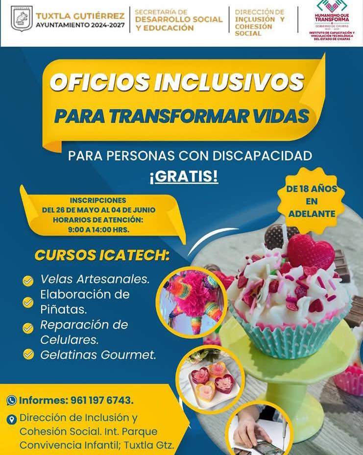 El Ayuntamiento de Tuxtla Gutiérrez anunció la apertura de inscripciones para el programa “Oficios Inclusivos para Transformar Vidas”, una iniciativa que ofrece capacitación gratuita a personas con discapacidad, con el objetivo de brindarles herramientas reales para su desarrollo económico y personal.