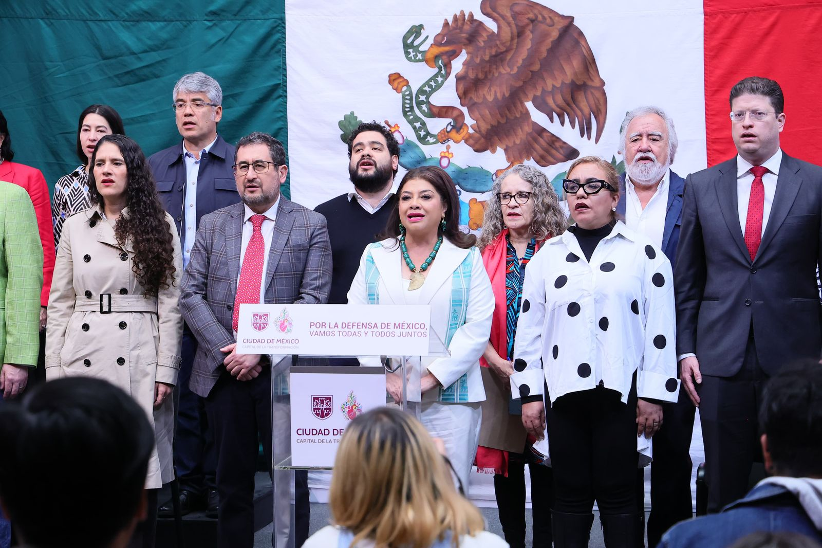 En uso de la palabra, Clara Brugada dijo que “nos unimos al llamado a la unidad nacional de la Presidenta Constitucional de los Estados Unidos Mexicanos, la doctora Claudia Sheinbaum Pardo, nos unimos a la defensa de México sin reservas ni condiciones, somos un país libre, democrático e independiente que establece relaciones de respeto, diálogo y cooperación con las naciones del mundo con plena soberanía y con base al principio de igualdad entre las naciones”.
