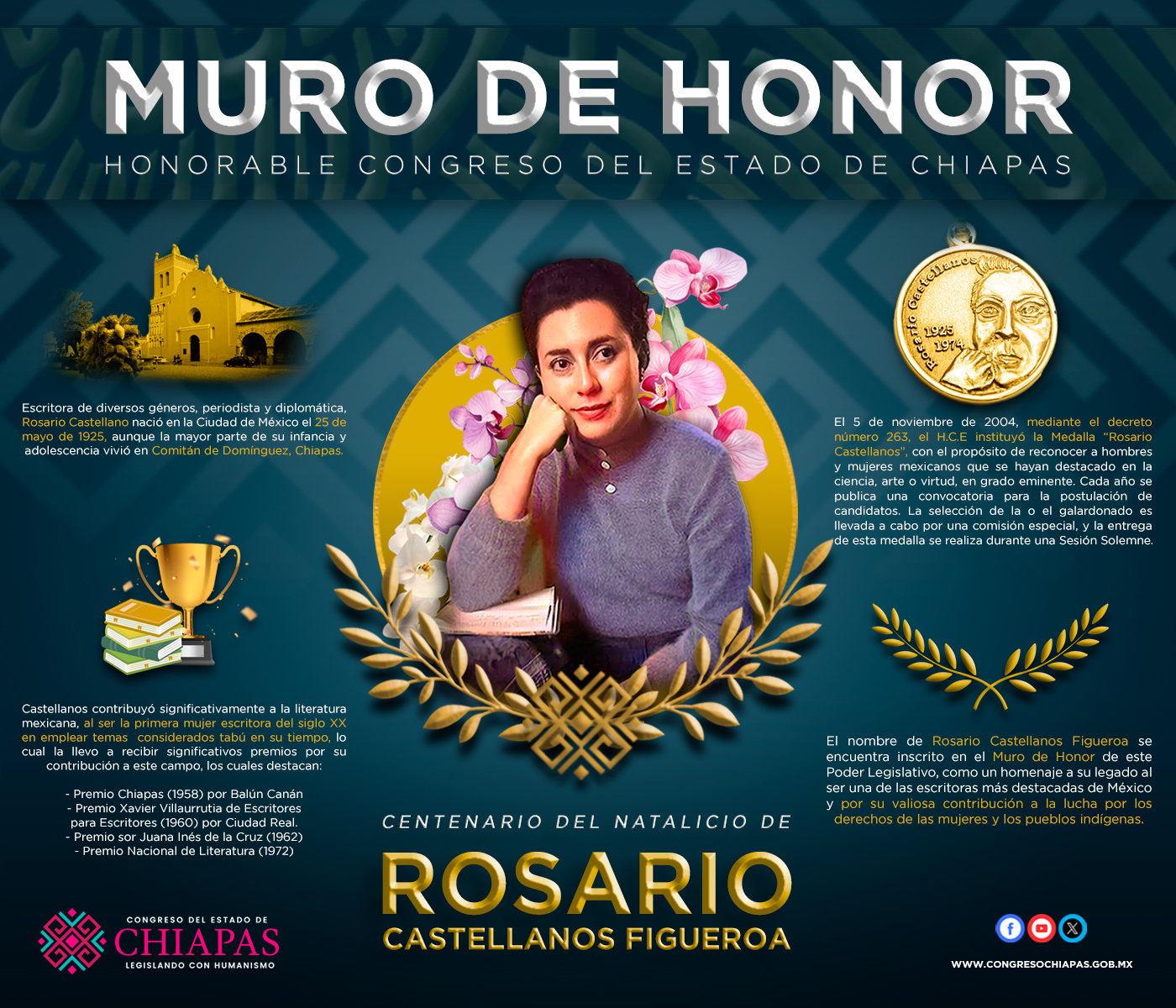Este 25 de mayo, el Congreso del Estado de Chiapas conmemora el Centenario del Natalicio de Rosario Castellanos Figueroa, destacada escritora, periodista y diplomática chiapaneca, considerada una de las más grandes literatas mexicanas del siglo XX y pionera en la defensa de los derechos de las mujeres y los pueblos indígenas.