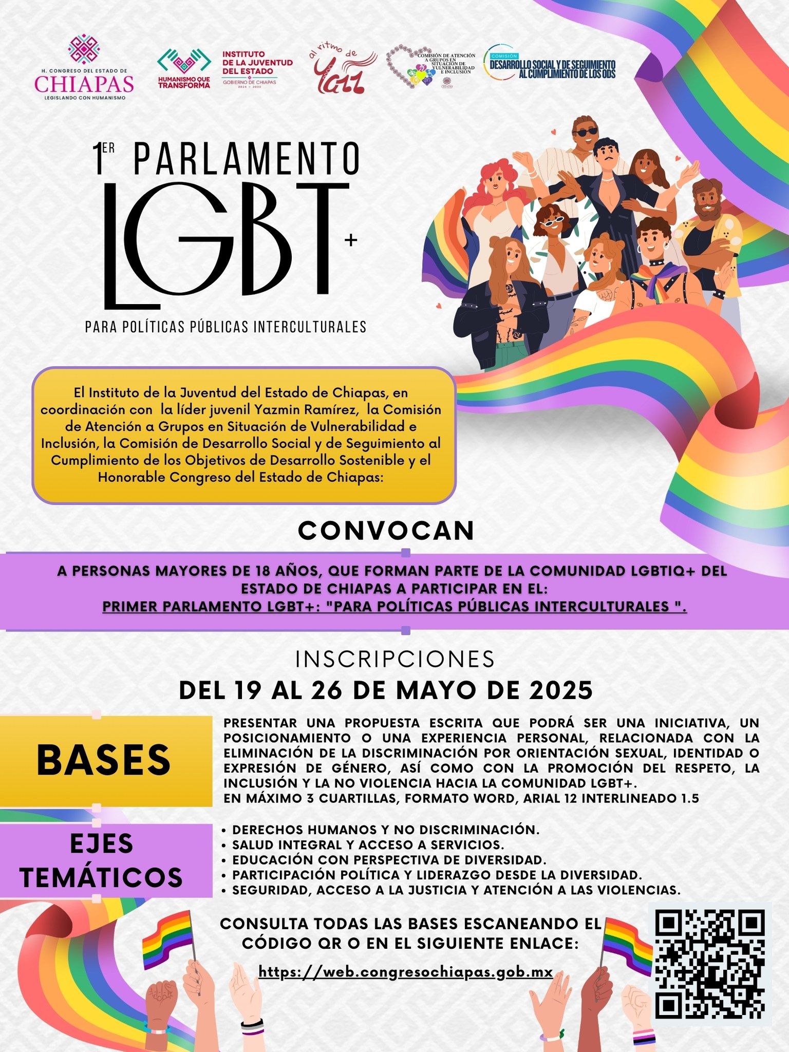 Las Comisiones de Atención a Grupos en Situación de Vulnerabilidad e Inclusión; Desarrollo Social; y Seguimiento al Cumplimiento de los Objetivos de Desarrollo Sostenible del Honorable Congreso del Estado, en coordinación con el Instituto de la Juventud del Estado de Chiapas, anunciaron la convocatoria al 1er Parlamento LGBT+: “Para Políticas Públicas Interculturales”.