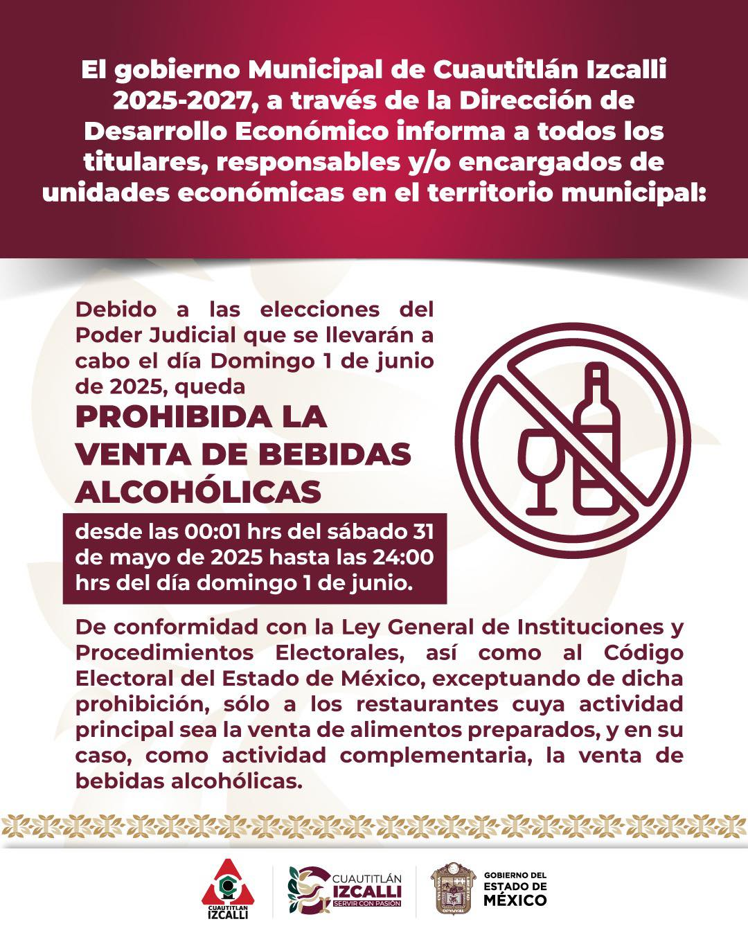 El Gobierno Municipal de Cuautitlán Izcalli, a través de la Dirección de Desarrollo Económico, informó que con motivo de las elecciones del Poder Judicial a realizarse el próximo domingo 1 de junio de 2025, se aplicará la Ley Seca en todo el municipio, prohibiendo la venta de bebidas alcohólicas durante el fin de semana electoral.