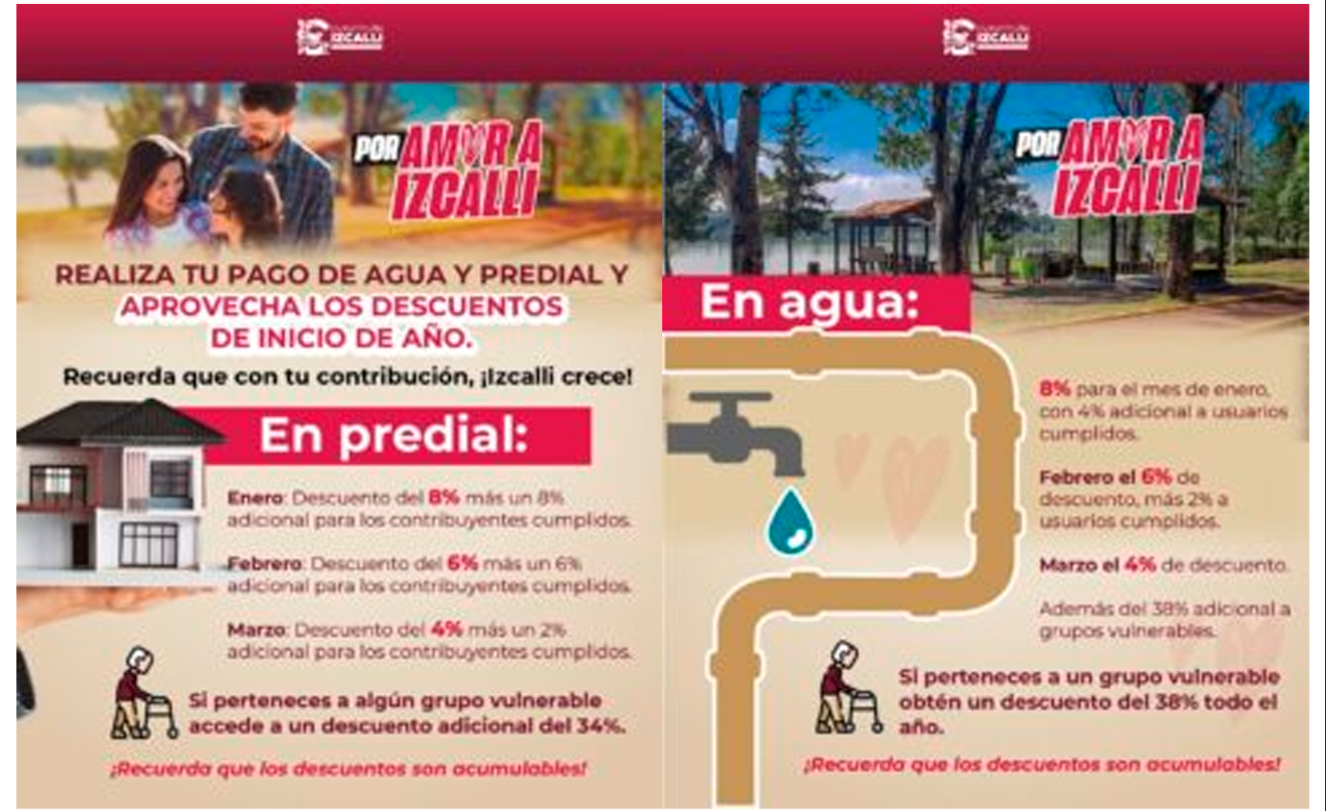 Los izcallenses pueden realizar sus pagos de manera presencial en las oficinas centrales de la Tesorería y de Operagua , ubicadas en la colonia Centro Urbano , así como en las seis receptorías distribuidas en Jardines del Alba, Bosques del Lago, La Quebrada, Fraccionamiento San Antonio, Paseos de Izcalli y Jardines de la Hacienda . Para mayor comodidad, los pagos también pueden realizarse en línea a través de los portales oficiales del Gobierno Municipal: