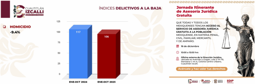 El Gobierno Municipal de Cuautitlán Izcalli reportó una disminución del 9.4% en la comisión de homicidios dolosos hasta octubre de 2025, como resultado de la coordinación interinstitucional implementada a nivel nacional por iniciativa de la presidenta de México, Claudia Sheinbaum, mediante la Estrategia Nacional de Seguridad.