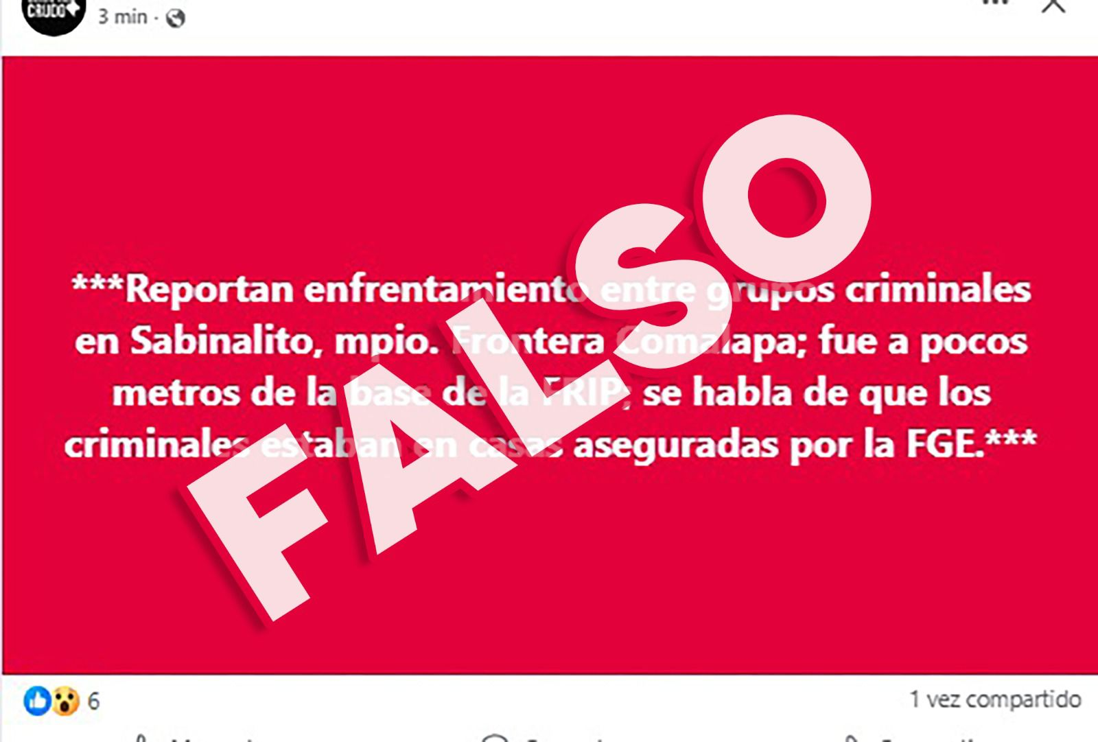 La Fiscalía General del Estado (FGE) de Chiapas desmintió categóricamente la información difundida en redes sociales sobre un presunto enfrentamiento entre grupos criminales en el ejido El Sabinalito, municipio de Frontera Comalapa. Tras realizar las investigaciones correspondientes y coordinar acciones con diversas corporaciones de seguridad, se determinó que no existen indicios ni denuncias relacionadas con dichos hechos.