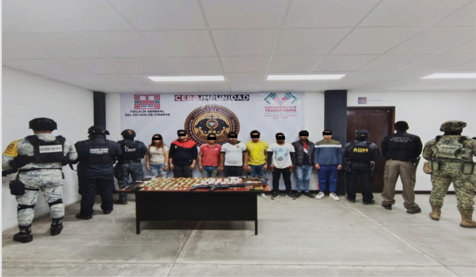 La Fiscalía General del Estado, en coordinación con la Secretaría de la Defensa Nacional, la Fiscalía General de la República, la Guardia Nacional y la Secretaría de Seguridad del Pueblo, detuvieron a Rashell “N”, Raúl “N”, José “N”, Aurelio “N”, Mauricio “N”, Porfirio “N”, Miguel “N” y Jesús “N”; estos últimos dos originarios del estado de Oaxaca, como presuntos responsables de los delitos de narcomenudeo, con la variante de posesión con fines de comercio del narcótico conocido como metanfetamina, así como de portación de arma de fuego sin licencia de uso exclusivo de las fuerzas armadas, por hechos ocurridos en el municipio de Cintalapa de Figueroa.