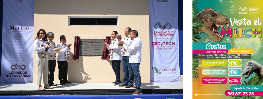 El gobernador Eduardo Ramírez Aguilar, acompañado por la directora general de Obras Comunitarias de la Secretaría de Desarrollo Agrario, Territorial y Urbano (Sedatu), Ana Gabriela Villanueva Huerta, en representación de la secretaria Edna Vega Rangel, y por el vicealmirante retirado, Octavio Sánchez Guillén, director general del Corredor Interoceánico del Istmo de Tehuantepec (CIIT), inauguró obras en los planteles 06 Acapetahua y 03 Villa Comaltitlán del Colegio de Estudios Científicos y Tecnológicos de Chiapas, realizadas mediante la Vertiente Obras Comunitarias, con una inversión cercana a los 10 millones de pesos.
