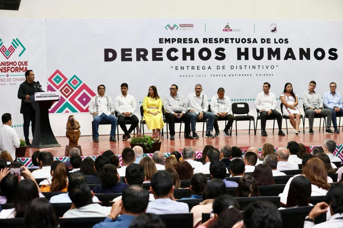 El gobernador de Chiapas, Eduardo Ramírez Aguilar, hizo un llamado al sector empresarial para impulsar la inclusión laboral y el respeto a los derechos humanos, en el marco de la entrega del distintivo Empresa Respetuosa de los Derechos Humanos. Durante el evento, el mandatario reconoció el compromiso de empresarias y empresarios que contribuyen a la construcción de un Chiapas justo, equitativo, incluyente e igualitario.