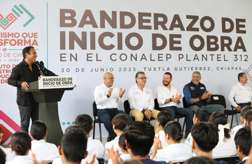 Durante el banderazo del inicio de obras de infraestructura educativa en el Colegio Nacional de Educación Profesional Técnica (Conalep) Plantel 312, de Tuxtla Gutiérrez, el gobernador Eduardo Ramírez Aguilar reafirmó su compromiso con la ampliación de espacios escolares y la dotación de herramientas tecnológicas que garanticen una mejor preparación académica para la juventud chiapaneca.