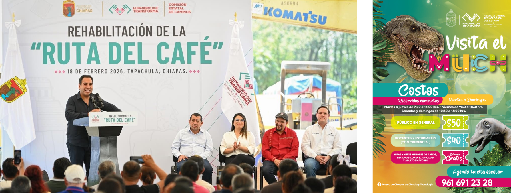 Durante una gira de trabajo por Tapachula, el gobernador Eduardo Ramírez Aguilar dio inicio a los trabajos de rehabilitación de la Ruta del Café, con una inversión superior a 40 millones de pesos en beneficio de más de 357 mil habitantes. En ese marco, destacó que una de las prioridades del gobierno de la Nueva ERA es impulsar el desarrollo social, económico y productivo de la Perla del Soconusco.