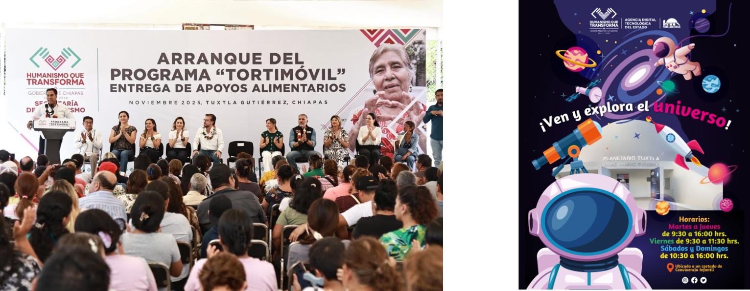 El secretario del Humanismo, Paco Chacón, detalló que el Tortimóvil del Humanismo visitará al menos dos colonias por semana, con el fin de complementar la labor de los Comedores del Humanismo y fortalecer la economía y la nutrición de las familias. Asimismo, anunció la entrega de paquetes alimentarios, a través del programa Cuidar es Amar, a la Comisión Ejecutiva Estatal de Atención a Víctimas, al Centro Estatal de Trasplantes del Estado de Chiapas (Cetrach) y a la Fundación Granito de Arena, para apoyar directamente a quienes más lo requieren.