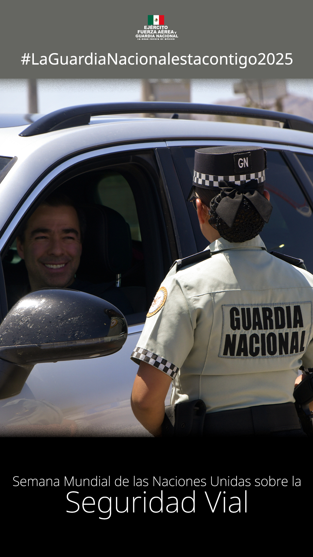 En el marco de la Semana Mundial de las Naciones Unidas sobre la Seguridad Vial, el Ejército Mexicano, la Fuerza Aérea Mexicana y la Guardia Nacional refrendaron su compromiso con la protección de la vida en las vías públicas, sumándose a esta conmemoración que busca generar conciencia y fomentar prácticas responsables entre conductores, peatones y ciclistas.
