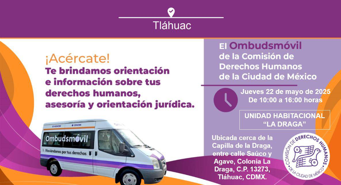 La Comisión de Derechos Humanos de la Ciudad de México (CDHCM) anunció la próxima visita del Ombudsmóvil a la Unidad Habitacional “La Draga”, ubicada entre las calles Saúco y Agave. La jornada se llevará a cabo el jueves 22 de mayo, en un horario de 10:00 a 16:00 horas, y tiene como objetivo acercar servicios de orientación jurídica y promoción de los derechos humanos a la comunidad.