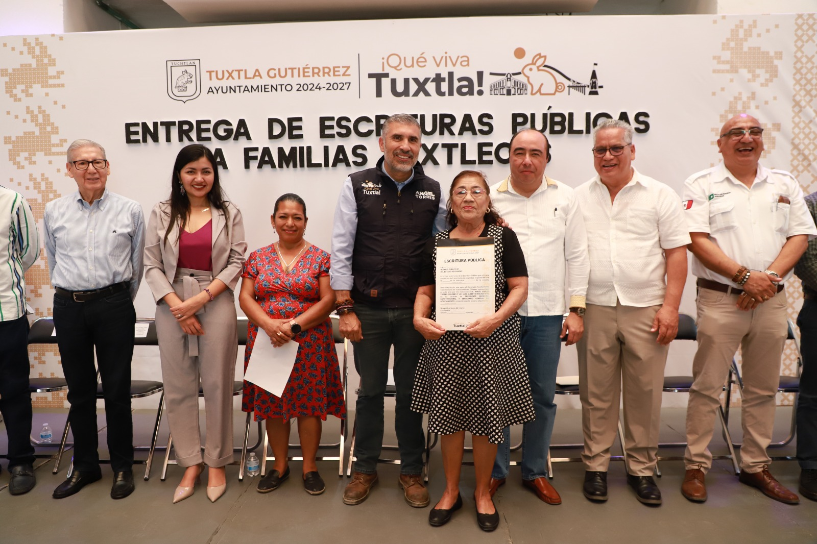 El alcalde de Tuxtla Gutiérrez, Angel Torres, encabezó la entrega de escrituras públicas a familias de siete colonias de la capital chiapaneca, como parte de los compromisos del gobierno municipal y de los objetivos plasmados en el Plan Tuxtla 4T.