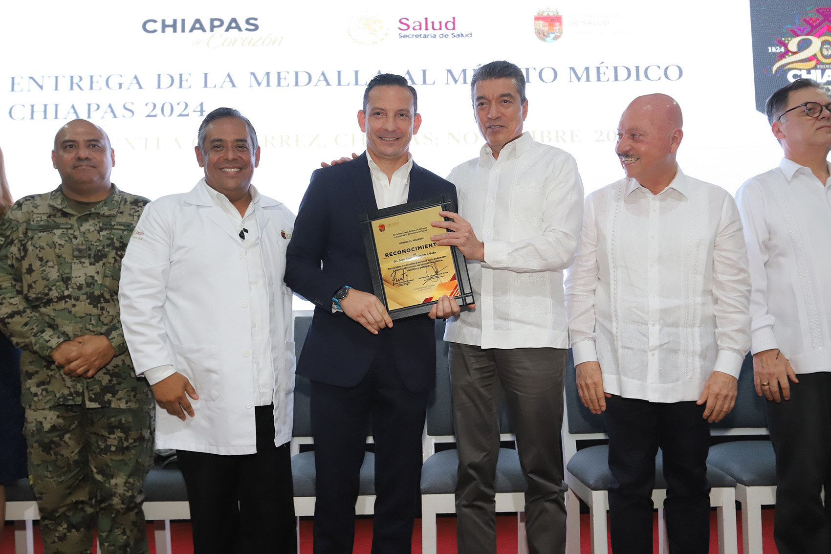 El gobernador Rutilio Escandón Cadenas entregó la Medalla al Mérito Médico Chiapas 2024, al doctor Jesús Sepúlveda Delgado, a quien reconoció como una persona de grandes valores, sensible, humanista, altamente profesional y con mucho potencial de crecer y aportar en el campo de la investigación de la medicina, lo que contribuirá a mejorar la atención y, sobre todo, a prevenir y salvar muchas vidas.