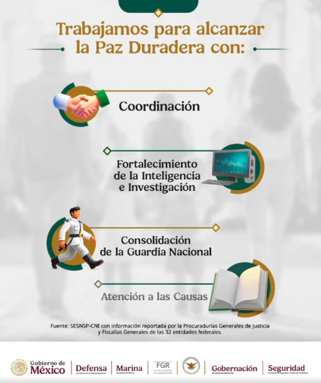García Harfuch enfatizó que el compromiso institucional es mantener esta tendencia a la baja y seguir perfeccionando las herramientas operativas, logísticas y tecnológicas para salvaguardar la vida y la tranquilidad de las y los mexicanos. Reiteró que la coordinación entre los tres niveles de gobierno es esencial para consolidar una política de seguridad efectiva y sostenible.