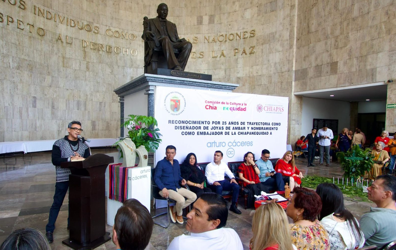 Al respecto, Selene Josefina Sánchez Cruz destacó que Arturo Cáceres, arquitecto por la UNAM, ha puesto en alto el nombre de Chiapas por su vocación al servicio de la cultura y por su destacada labor con el ámbar. Al hacer uso de la palabra, Arturo Cáceres agradeció al Congreso del Estado por la distinción y dijo que seguirá trabajando a favor de la cultura y las tradiciones de Simojovel, y por supuesto, a continuar impulsando el trabajo con el ámbar.