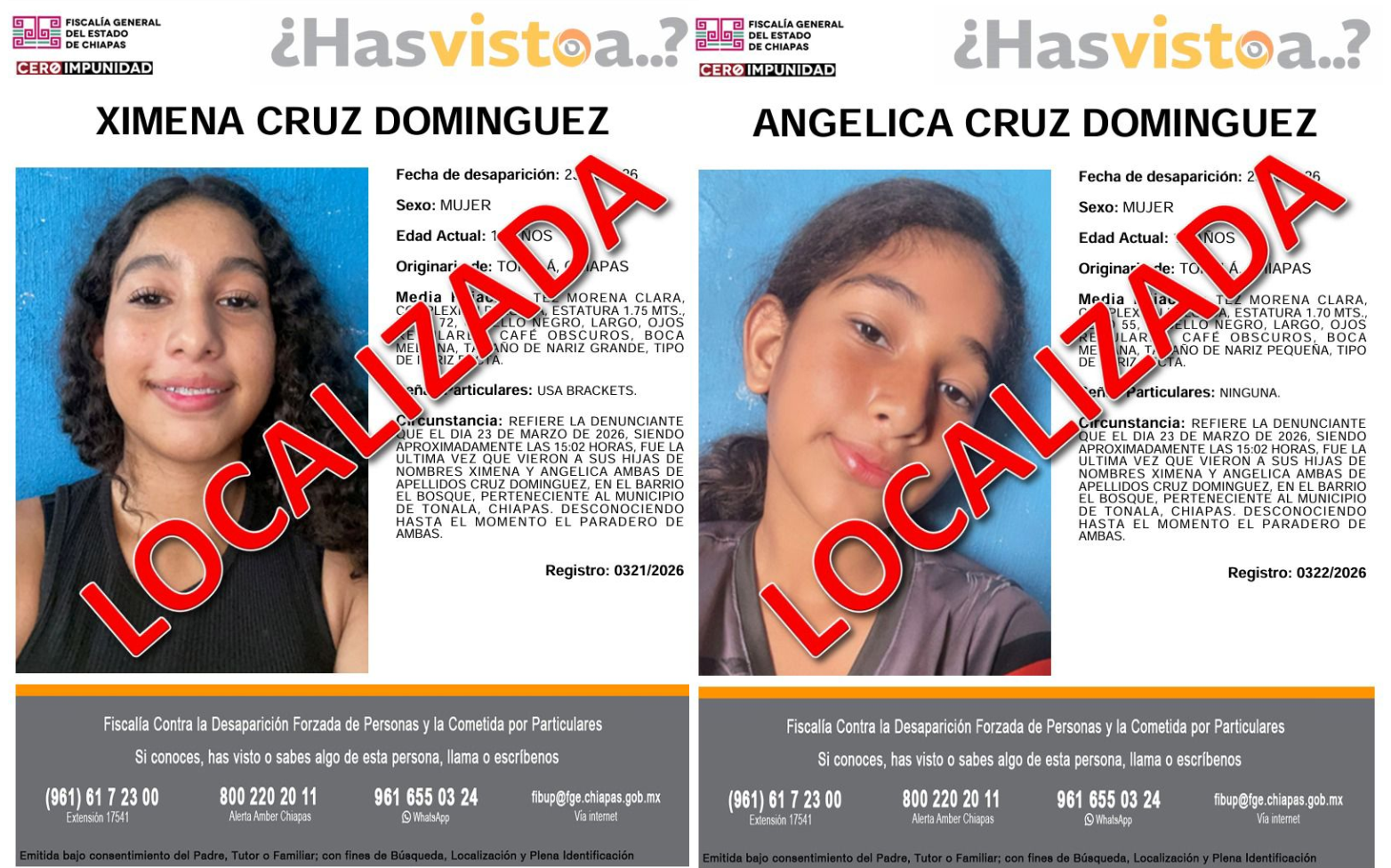 Tras la denuncia realizada por la madre de las jovencitas, los elementos implementaron los mecanismos de protocolo de búsqueda continua, permanente e ininterrumpida, mediante los cuales ubicaron a las adolescentes en buen estado de salud, en el barrio Nicatán del municipio de Tonalá. Posteriormente, fueron presentadas ante el Ministerio Público para escucharlas en declaración, manifestando que su ausencia fue voluntaria.