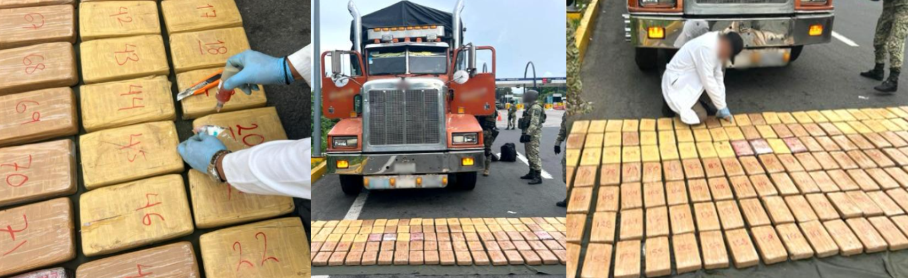 Durante la inspección del vehículo, los militares encontraron una bolsa con 11.1 gramos de marihuana y 418 paquetes rectangulares de clorhidrato de cocaína, con un peso total de 400.76 kilogramos, además de dinero en efectivo. El hallazgo dio origen a la puesta a disposición de los detenidos ante el Ministerio Público Federal.