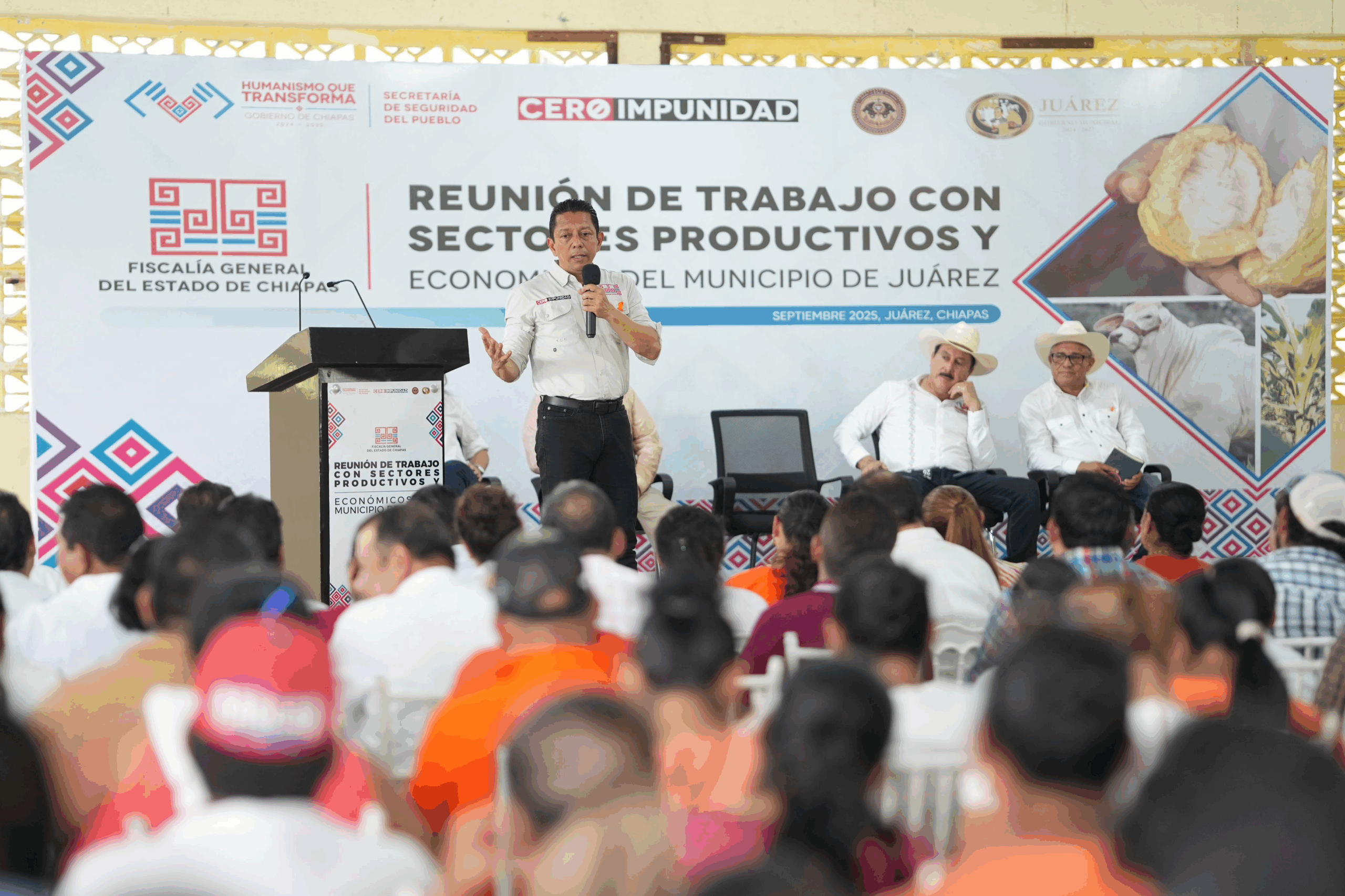 En gira de trabajo por la zona Norte de Chiapas, el Fiscal General del Estado, Jorge Luis Llaven Abarca, junto al Secretario de Agricultura, Ganadería y Pesca, Marco Antonio Barba Arrocha, sostuvieron una reunión con representantes de los sectores productivos de esta región.