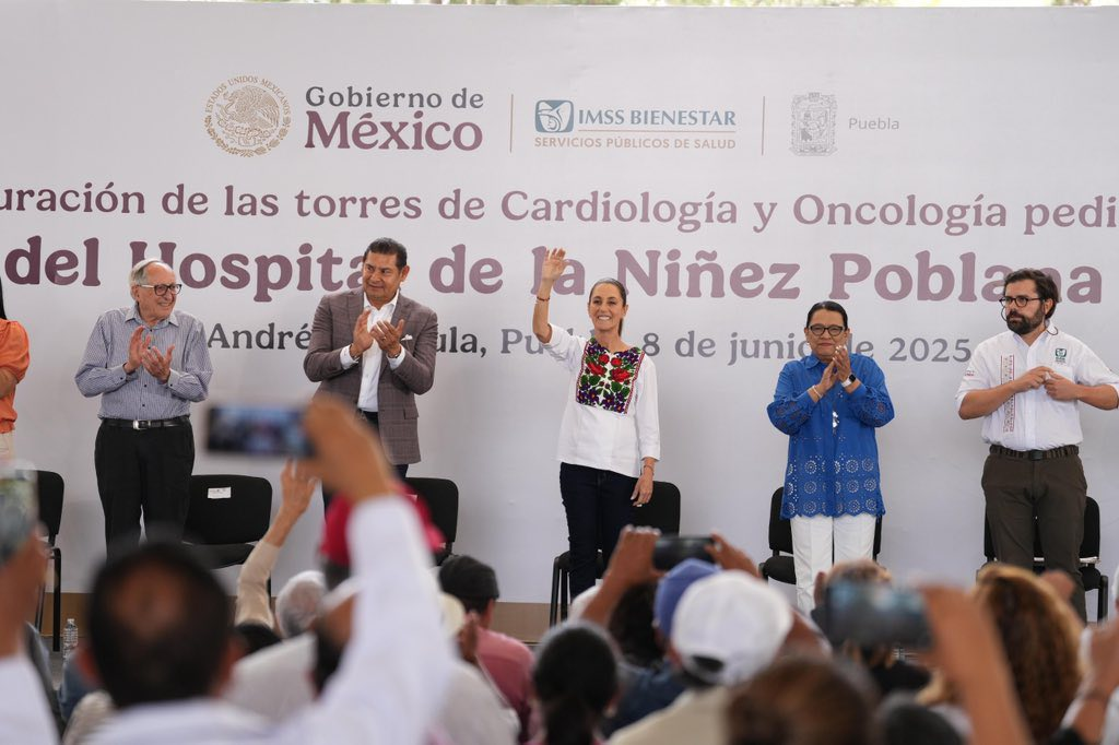 La secretaria de Gobernación, Rosa Icela Rodríguez, acompañó a la presidenta Claudia Sheinbaum Pardo en San Andrés Cholula, Puebla, para la inauguración de las torres de oncología pediátrica, cardiología y hemodinamia del Hospital de la Niñez Poblana, operado por los Servicios de Salud del IMSS Bienestar.