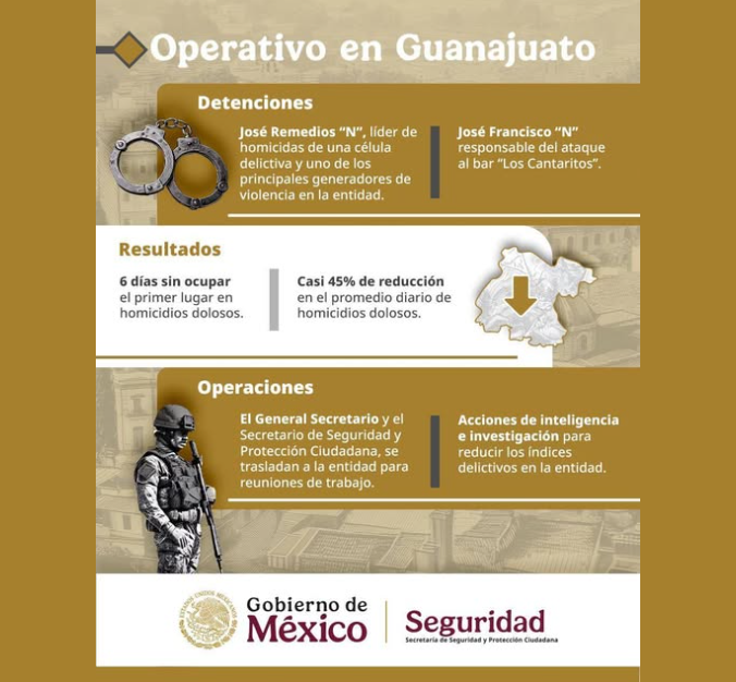 Con esta disminución en la tasa de homicidios, Guanajuato comienza a consolidar avances significativos en materia de seguridad, respondiendo al llamado ciudadano de paz y tranquilidad. Las autoridades federales y estatales reiteraron su compromiso de mantener acciones contundentes para garantizar la seguridad de la población.