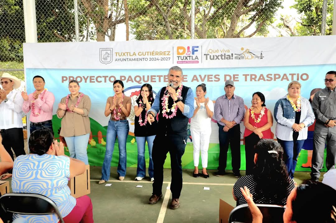 En una acción destinada a fortalecer la economía familiar y promover la autosuficiencia alimentaria, el presidente municipal de Tuxtla Gutiérrez, Ángel Torres, y la directora del DIF Tuxtla, Estephanie Frías, encabezaron el Programa Pollotón en el Ejido El Jobo, donde fueron beneficiadas mujeres con la entrega de 5,490 aves de traspatio, además de alimento.