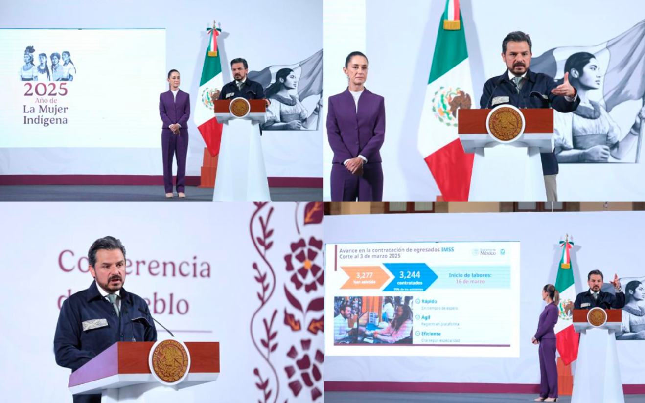 El director general del Instituto Mexicano del Seguro Social (IMSS), Zoé Robledo, informó que con el Reclutamiento de Médicos Especialistas IMSS 2025 se ha contratado, hasta el 3 de marzo, a 3 mil 244 médicas y médicos, el 99 por ciento de interesados en laborar en el Instituto. Durante la conferencia de prensa en Palacio Nacional que encabezó la presidenta de México, Claudia Sheinbaum Pardo, el director general del Seguro Social señaló que se espera que del 4 al 7 de marzo se complete la contratación de los especialistas restantes, en un proceso que se ha llevado a cabo de manera ágil, sin tiempos de espera significativos.