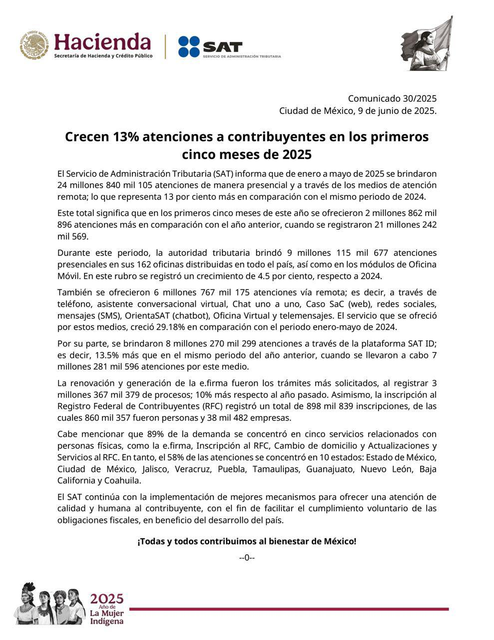 El Servicio de Administración Tributaria (SAT) reportó que de enero a mayo de 2025 brindó un total de 24 millones 840 mil 105 atenciones a contribuyentes, tanto de forma presencial como mediante canales remotos. Esta cifra representa un incremento del 13% en comparación con el mismo periodo de 2024.