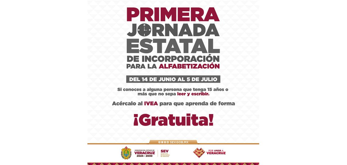 Con el objetivo de reducir el analfabetismo y acercar la educación básica a miles de veracruzanos, el Instituto Veracruzano de Educación para los Adultos (IVEA) puso en marcha la Primera Jornada Estatal de Incorporación para la Alfabetización, que se desarrollará hasta el 5 de julio en los 212 municipios de la entidad.