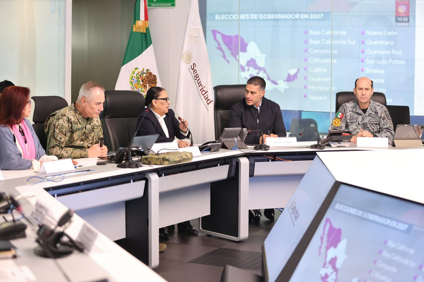 El titular de la SSPC, Omar García Harfuch, encabezó la sesión de coordinación junto a la secretaria de Gobernación, Rosa Icela Rodríguez, y representantes del Gabinete de Seguridad, quienes supervisan el desarrollo del proceso democrático en todo el territorio nacional.