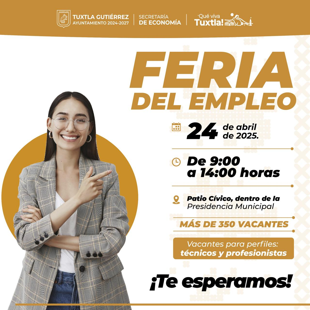 Con el objetivo de impulsar el desarrollo laboral en la capital chiapaneca, el Ayuntamiento de Tuxtla Gutiérrez, a través de la Secretaría de Economía, invita a la ciudadanía a participar en la Feria del Empleo, que se llevará a cabo el próximo 24 de abril de 2025. El evento se desarrollará de 9 de la mañana a 2 de la tarde en el patio cívico de la presidencia municipal.