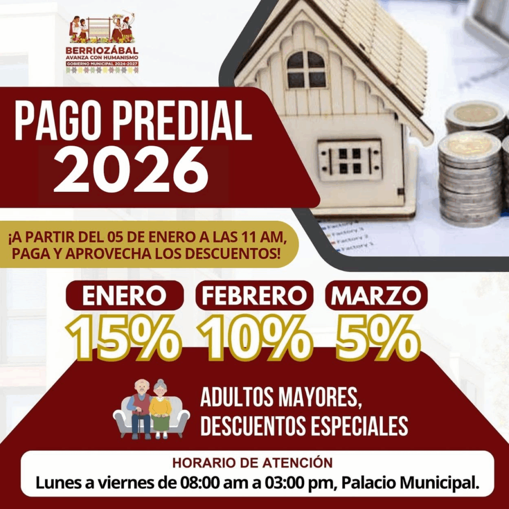El Gobierno Municipal de Berriozábal, Chiapas, informó que a partir del 5 de enero de 2026 está habilitado el pago del Impuesto Predial en las oficinas de la Tesorería Municipal. El servicio está disponible de lunes a viernes, en un horario de 8:00 a 15:00 horas.