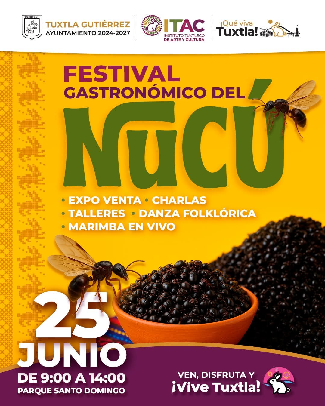 El Ayuntamiento de Tuxtla Gutiérrez, a través del Instituto Tuxtleco de Arte y Cultura (ITAC), invita a las familias a disfrutar del Festival Gastronómico del Nucú, mañana miércoles 25 de junio, en el Parque Santo Domingo, de 9 de la mañana a 2 de la tarde.