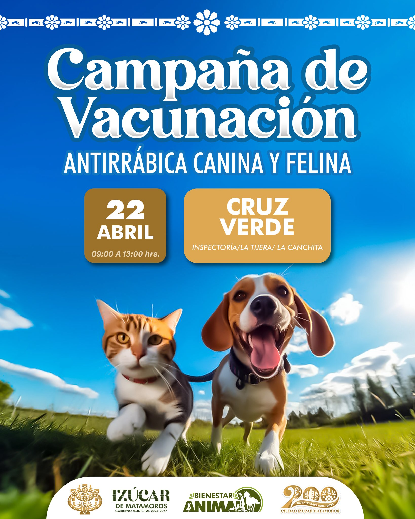 El Honorable Ayuntamiento de Izúcar de Matamoros, encabezado por el presidente municipal Eliseo Morales Rosales, convoca a la ciudadanía a participar en la Campaña de Vacunación Antirrábica Canina y Felina 2025, organizada por la Dirección de Bienestar Animal.