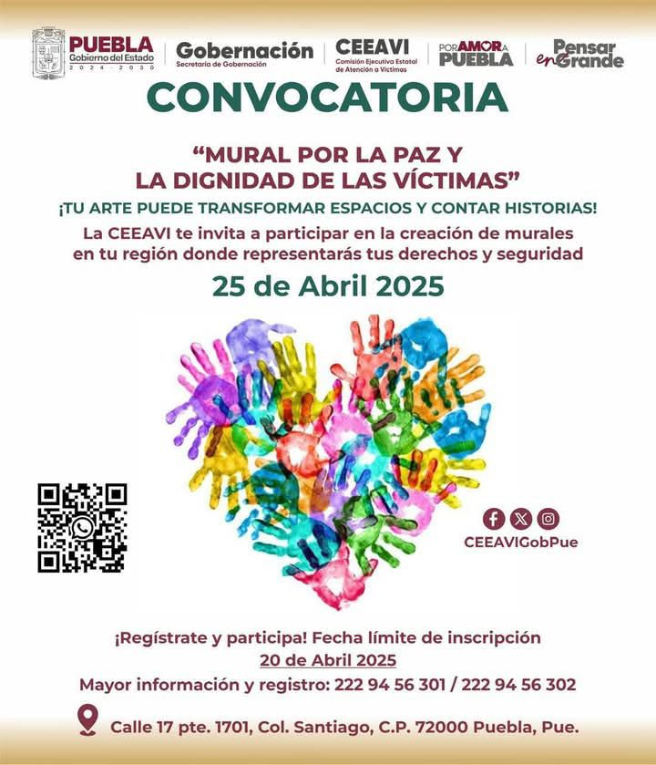 La Comisión de Atención a Víctimas del estado de Puebla lanzó una convocatoria abierta para sumarse al proyecto artístico “Mural por la Paz y la Dignidad de las Víctimas”, una iniciativa que busca transformar los espacios públicos mediante el arte y visibilizar las historias de quienes han sido víctimas de violencia. El llamado está dirigido a artistas y personas con vocación creativa interesadas en expresar, a través de la pintura mural, mensajes de esperanza, reconciliación y memoria. La fecha límite para registrarse es el 20 de abril de 2025.
