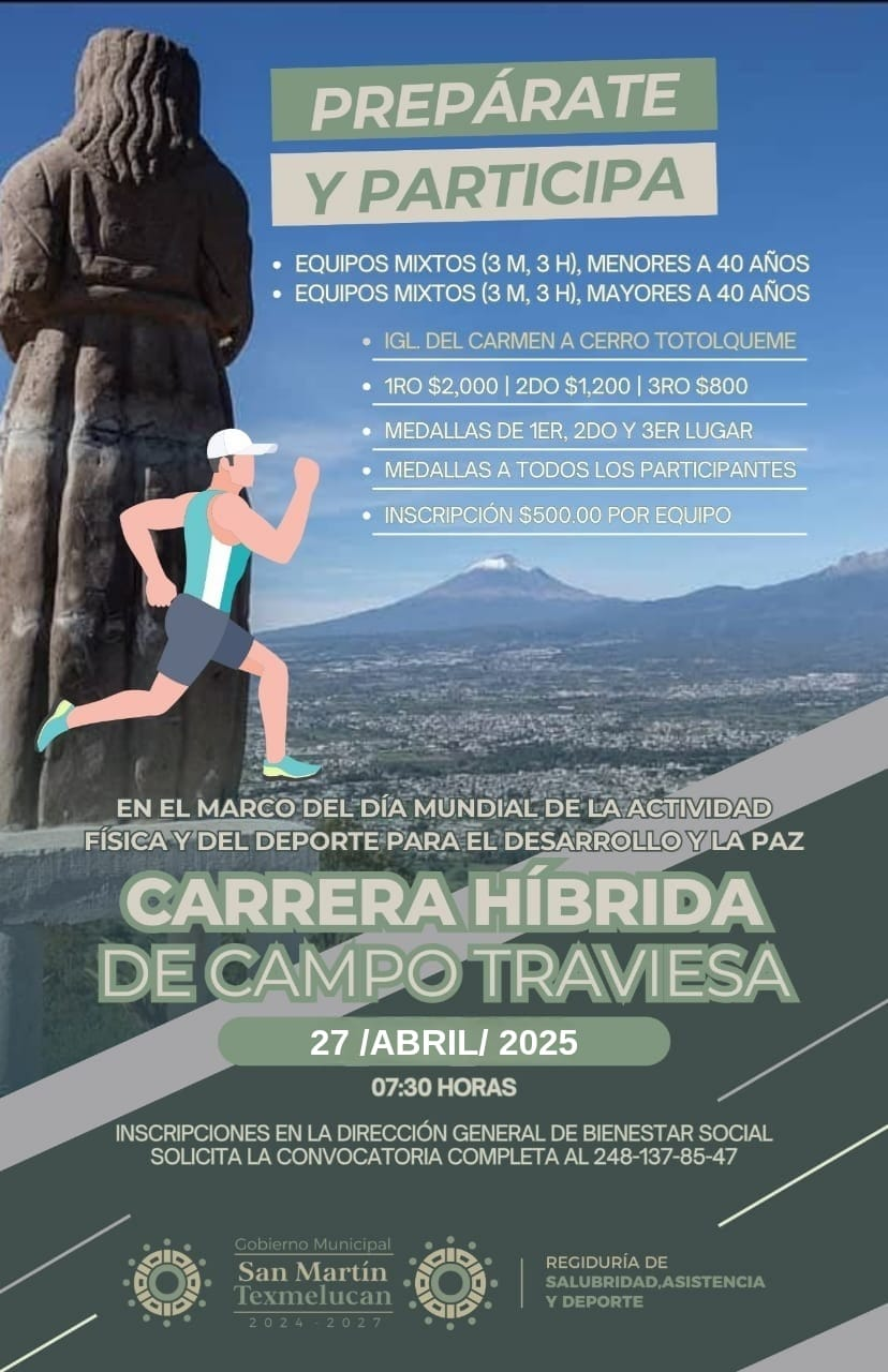El H. Ayuntamiento de San Martín Texmelucan, a través de la Jefatura de Fomento al Deporte, convoca a las y los texmeluquenses a participar en la carrera híbrida de campo traviesa, que se llevará a cabo el próximo domingo 27 de abril de 2025.