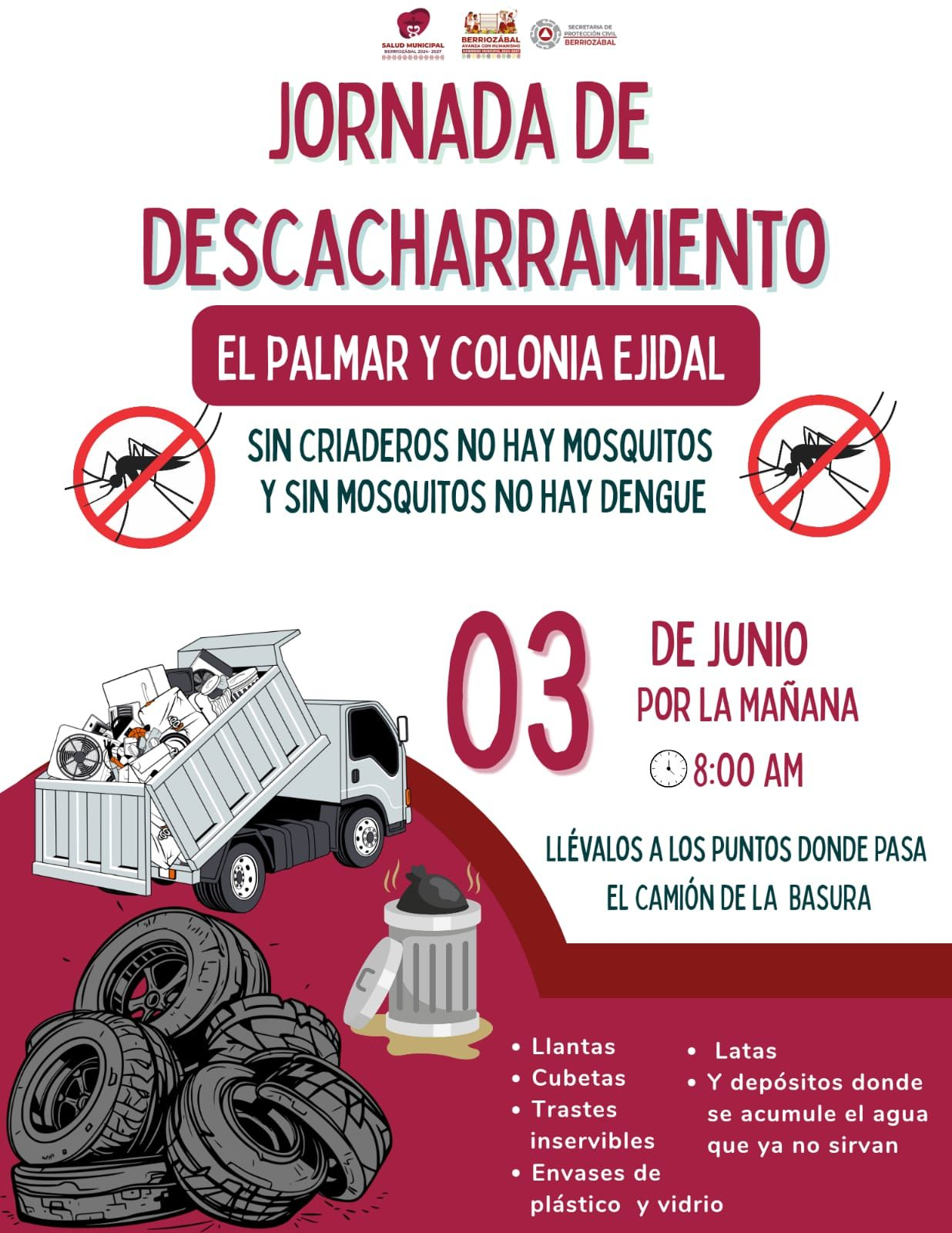 Con el objetivo de prevenir enfermedades transmitidas por el mosquito Aedes aegypti, como el dengue, zika y chikungunya, el Ayuntamiento de Berriozábal realizará este martes 3 de junio una jornada de descacharramiento en las colonias El Palmar y Ejidal. La actividad dará inicio a partir de las 8:00 de la mañana y busca la participación activa de la ciudadanía.