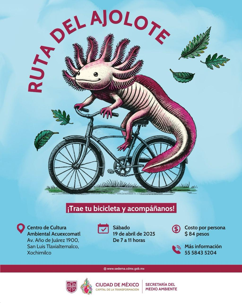 CIUDAD DE MÉXICO.— La Secretaría del Medio Ambiente (SEDEMA) capitalina invita a la ciudadanía a formar parte del recorrido biocultural “Ruta del Ajolote”, una rodada en bicicleta que se llevará a cabo el sábado 19 de abril, de 07:00 a 11:00 horas, por la emblemática zona chinampera de Xochimilco, con el objetivo de fomentar la educación ambiental y la conservación de sus ecosistemas lacustres.