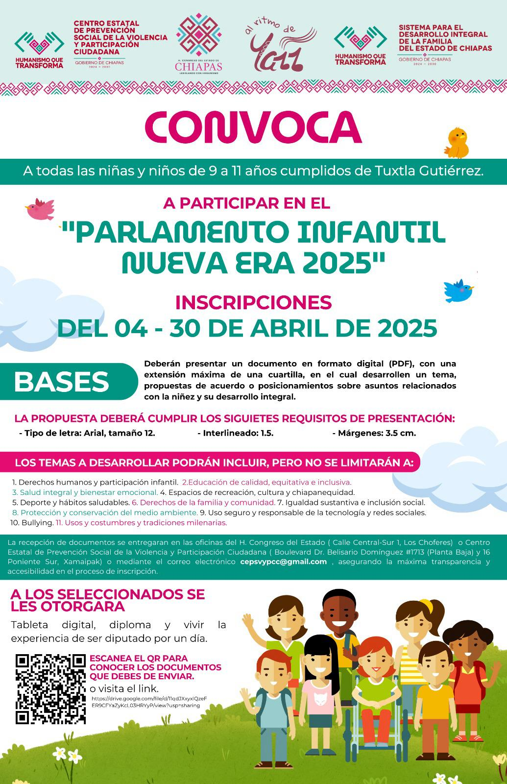 El Honorable Congreso del Estado de Chiapas, en coordinación con el Centro Estatal de Prevención Social de la Violencia y Participación Ciudadana, así como con el Sistema para el Desarrollo Integral de la Familia (DIF) del estado, lanzó la convocatoria para el Parlamento Infantil 2025. Este proyecto está dirigido a niñas y niños de entre 9 y 11 años de edad que residan en Tuxtla Gutiérrez, con el propósito de fomentar su participación activa en espacios de expresión y toma de decisiones, fortaleciendo así una cultura democrática desde la infancia.