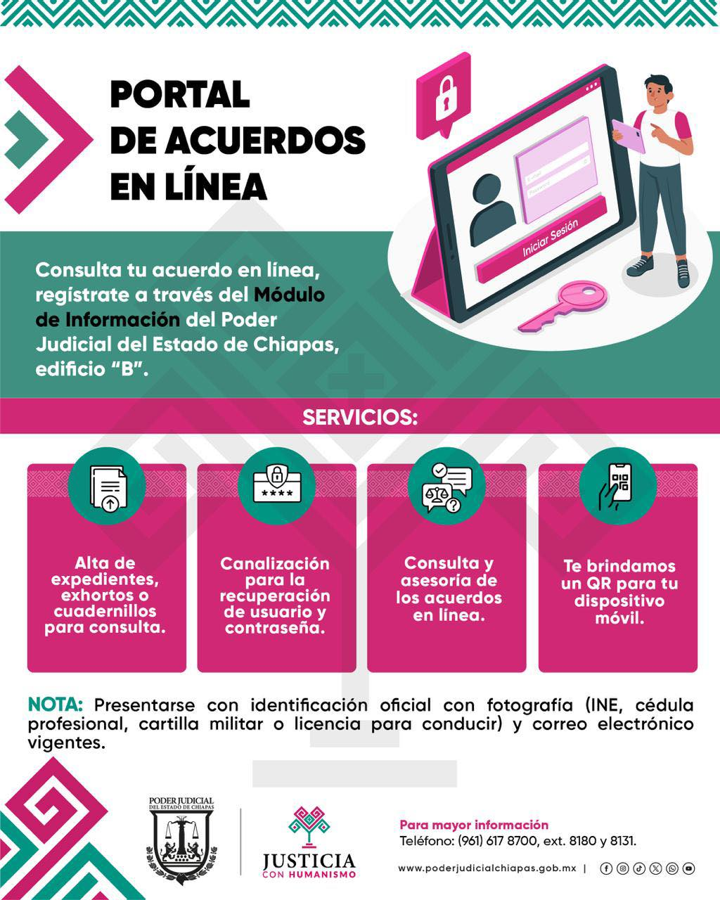 El Poder Judicial del Estado de Chiapas anunció la puesta en marcha del nuevo Portal de Acuerdos en Línea, una herramienta digital diseñada para facilitar el acceso a la información jurídica y mejorar la atención a los usuarios del sistema de justicia. Este servicio permite realizar diversos trámites de manera remota, promoviendo así una justicia más cercana y eficiente.
