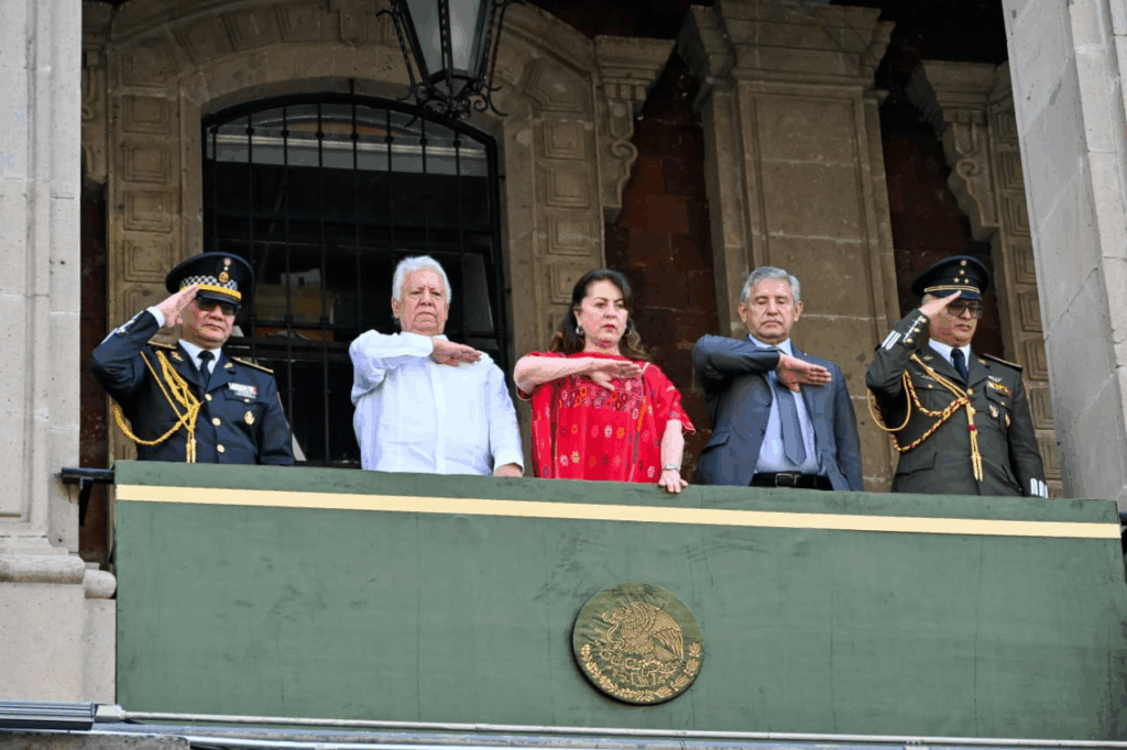 La mandataria estatal presenció el desfile desde el balcón del Palacio de Gobierno, acompañada por el magistrado presidente del Tribunal Superior de Justicia, Juan Emilio Elizalde Figueroa; mandos militares de la 24/a Zona Militar y de la Guardia Nacional; así como por integrantes del gabinete estatal y el presidente municipal de Cuernavaca, José Luis Urióstegui Salgado.
