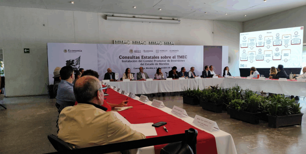 La gobernadora de Morelos, Margarita González Saravia, encabezó la instalación del Comité Promotor de Inversiones y Consultas T-MEC, en coordinación con la Secretaría de Economía (SE) del Gobierno de México, así como con representantes del sector empresarial. Con esta acción, Morelos se integra a la red de estados que forman parte de la Estrategia Nacional de Atracción de Inversiones, alineada con los objetivos del Plan México, para fortalecer la economía nacional y regional.