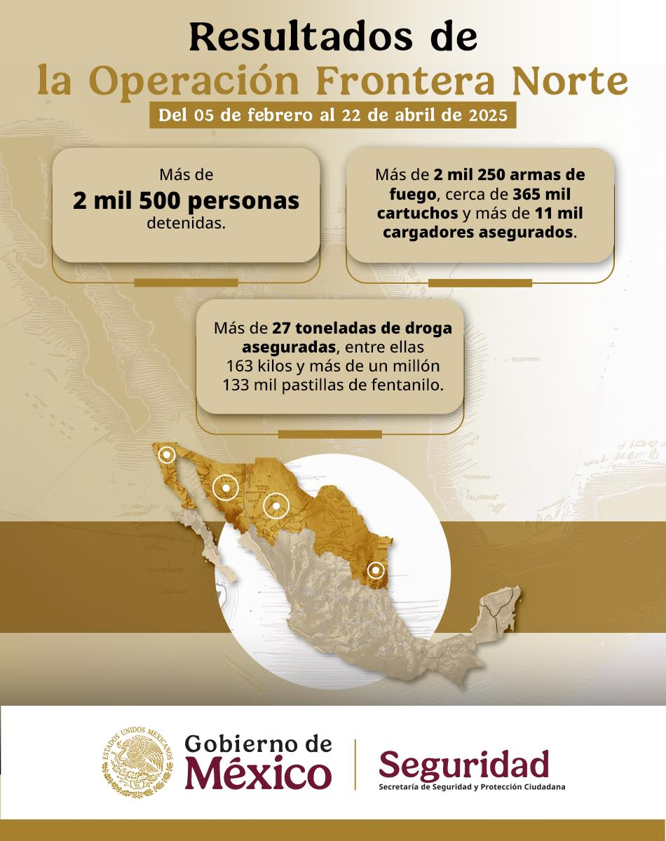 En cumplimiento a la instrucción de la Presidenta Claudia Sheinbaum Pardo, desde el pasado 5 de febrero se implementó la “Operación Frontera Norte”, con el objetivo de construir una paz duradera en los estados del norte del país. Esta estrategia forma parte del despliegue nacional del Gabinete de Seguridad y ha permitido coordinar esfuerzos entre diversas instituciones para debilitar estructuras criminales.