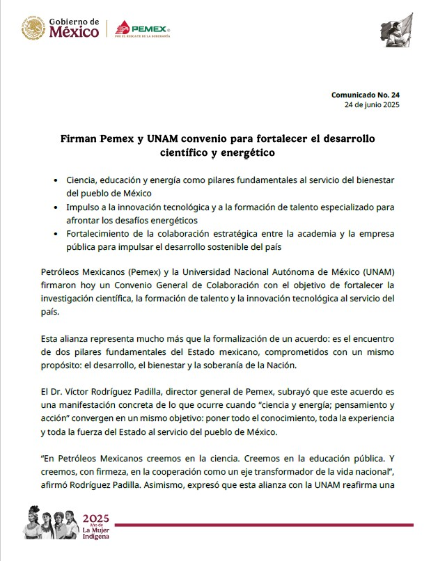 Petróleos Mexicanos (Pemex) y la Universidad Nacional Autónoma de México (UNAM) firmaron un Convenio General de Colaboración que busca fortalecer la investigación científica, la innovación tecnológica y la formación de talento especializado, pilares estratégicos para enfrentar los desafíos del sector energético nacional y contribuir al desarrollo sostenible del país.